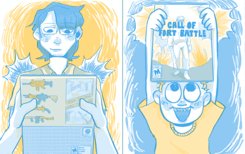 Call of Fort BattleA 6-page zine about raging during games. Risographed in cornflower and sunflower. View fullsize Slide 1 Slide 1 (current slide) Slide 2 Slide 2 (current slide) Slide 3 Slide 3 (current slide)